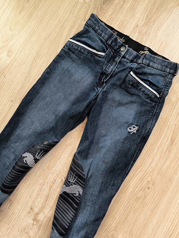 Bryczesy jeansowe Spooks. Z kolanowym silikonem super trzymający. Jeansowe wygodne. Z nogawka Flexi. Bardzo stylowe. Stan bardzo dobry lekkie ślady użytkowania.