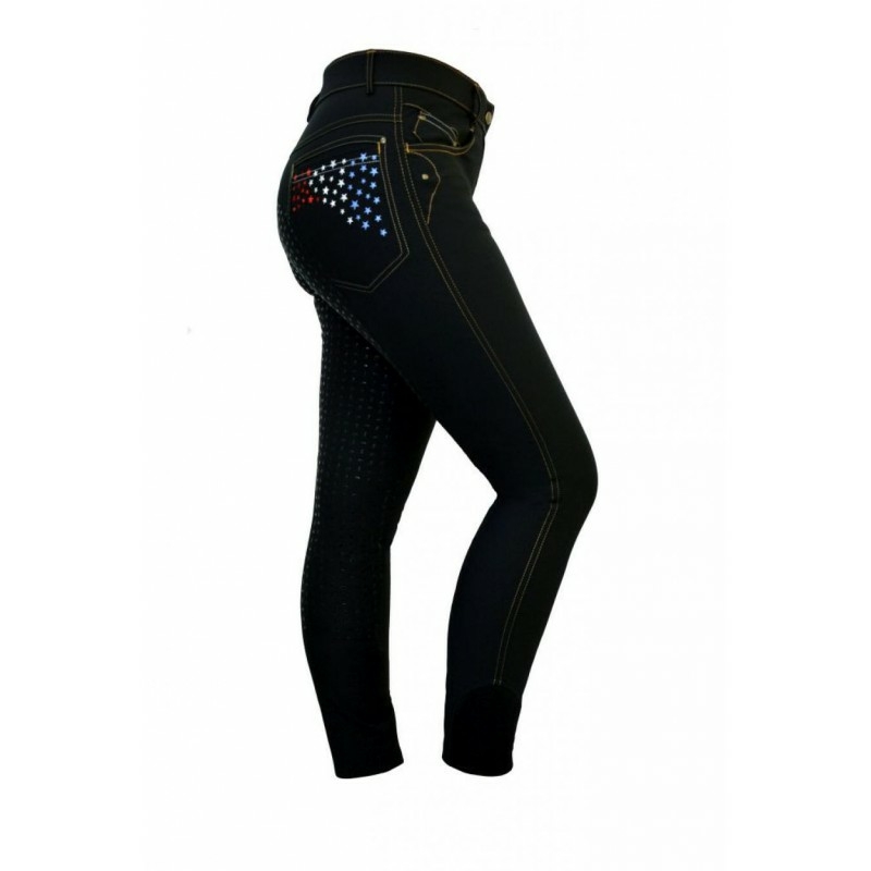 Funkcjonalne bryczesy w sportowym stylu. Wykonane z lekkiego, mocno dopasowującego się materiału. Dla zapewnienia doskonałej przyczepności zastosowano pełen lej silikonowy. Spodnie posiadają po dwie kieszonki z przodu i z tyłu oraz elastycznie zakończenia nogawek. Z tyłu ozdobione haftem w gwiazdki.