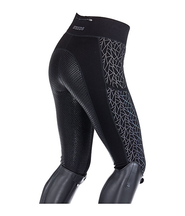 Szczegółowe, oddychające legginsy jeździeckie z wysokim stanem i wygodnym, pełnym lejem wykonanym z elastycznego materiału. Tęczowy, odblaskowy geometryczny nadruk na zewnętrznej stronie nogawki. Z boczną kieszenią na telefon komórkowy na udzie i małą kieszenią na suwak z tyłu w pasie. Szeroki pas dla optymalnego komfortu. 68% wiskoza, 28% nylon, 4% elastan.