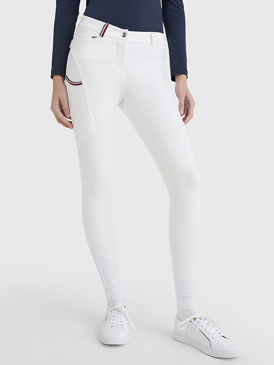 Techniczne bryczesy konkursowe Tommy Hilfiger Equestrian białe jeździeckie wykonane z podwójnej dzianiny 4-way stretch z ukrytą kieszonką na monety zapinaną na zamek oraz kieszonką na smartfona na udzie , oba na prawej nogawce.
