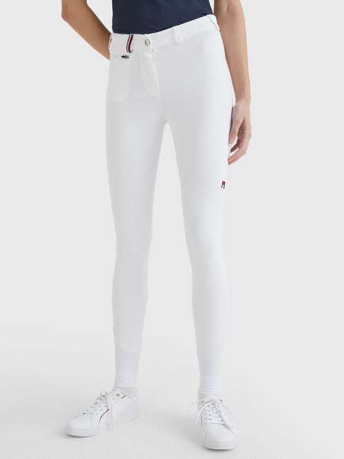 Lekkie, letnie bryczesy jeździeckie Tommy Hilfiger Equestrian białe konkursowe z boczną kieszenią zapinaną na zamek, szlufkami na pasek, tylnymi kieszeniami w stylu jeansów i haftowanym logo na lewej nogawce. Szlufki paska ozdobione są pasiastą wstążką TH Global. Pełny silikonowy chwyt zapewniający idealne trzymanie w siodle. Końcówki nogawek wykonane z wyjątkowo cienkiego, elastycznego materiału dla jeszcze większego komfortu. Zapięcie w pasie z przodu na haftkę i dodatkowy guzik bezpieczeństwa.nowe z metką. Rozmiar Xl z stronę mniejszych niż większych.