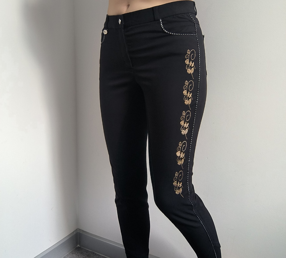 Bryczesy USG. Czarne. Jeśli szukasz wyjątkowych bryczesów pod względem ich wyglądu to super trafiłaś ! Takie okazy zdarzają się niesamowicie rzadko. A wyglądaja bardzo oryginalnie i kobieco. Na żywo jeszcze lepiej ;) po bokach mamy wzór kwiatowy w beżowym odcieniu idealnie pasuje do całości. Mnie osobiście to kupiło ! Są ciekawe inne niż wszystkie i oryginalne. Do tego całkiem wygodne z pełnym lejem zamsz i nogawka Flexi. Stan ogólny idealny. Rozmiar Francuski 38 i właśnie na 38 M najlepiej pasuja. Pas 37 cmx2 biodra 43 cmx2 dl całkowita 88 cm wew 65 cm standardowy stan