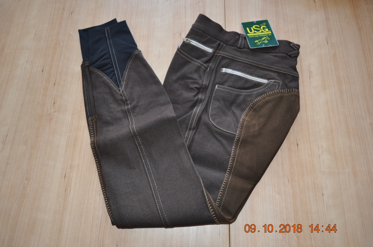 Sprzedam bryczesy marki USG model Sara. Bryczesy brązowe, z jaśniejszym, pełnym lejem. Nogawki zakończone materiałem typu flexi. Model wielokieszonkowy.