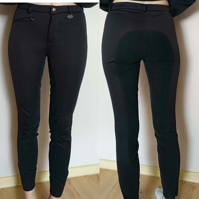 Bryczesy zimowe Softshell HKM. stan bardzo dobry do wyprania, mają ślady w kroku nitki się zaczynają rozchodzić (zdj 3) . Rozmiar 34 (164) pas 33 cm x2 biodra 38 cm x2 dl wew 68 cm zew 88 cm m standardowy stan cena 100 zł