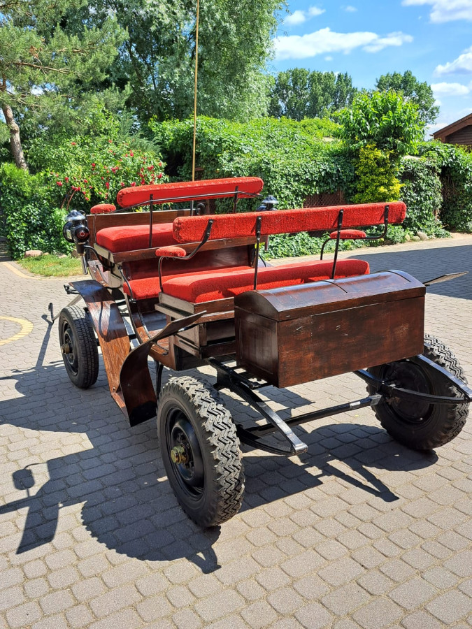 Sprzedam bryczkę typu Waland. Bryczka posiada dysze na pojedynczego konia jak i na parę. Ma kufer z tyłu, hamulec i lampy, siedzenia są wybite bordowym golenitem. Jest w idealnym stanie.