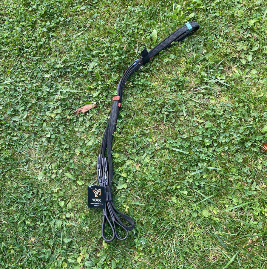 Nowe skórzano-taśmowe wodze York antypoślizgowe - niezbyt grube, z gumowaną nicią, bardzo wygodne do trzymania.