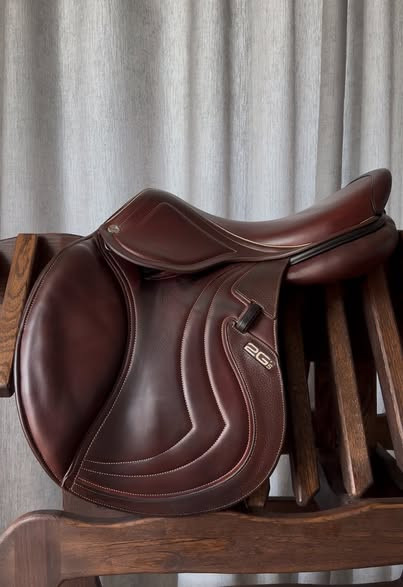 Siodło w idealnym stanie z niewielką niedoskonałością na tylnym leku, brązowe z czarnymi dodatkami, bardzo eleganckie i piękne. Elastyczne panele, miękka i przyczepna skóra cielęca.