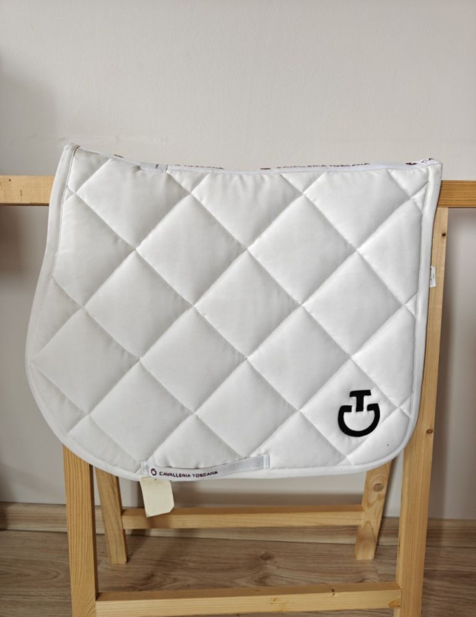 Sprzedam czaprak skokowy renomowanej włoskiej marki premium Cavalleria Toscana. Jest to czaprak w rozmiarze Pony o kolorze białym. Czaprak jest powystawowy, nie był używany ale ma jedną malutka plamkę tuż przy logo (zdjęcie). Wykonany z materiałów wysokiej jakości, przewiewny i bardzo dobrze wchłaniający pot.
