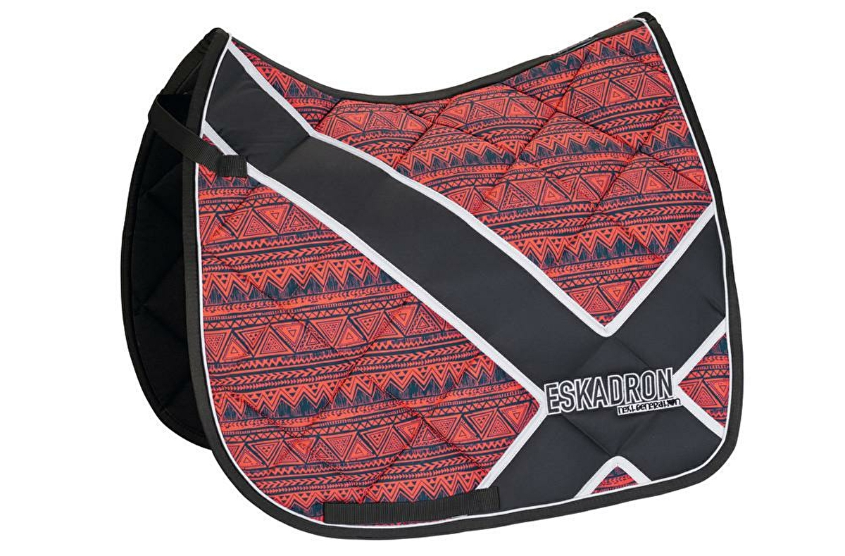 "Czaprak z kolekcji Eskadron Next Generation, wiosna-lato 2017. Wykonany z wysokiej jakości materiałów. Pikowany w duże romby. Podszyty materiałem odprowadzającym pot. Ozdobiony naszyciem w kontrastowym kolorze, na którym jest umieszczony napis Eskadron. Obszyty subtelną lamówką."