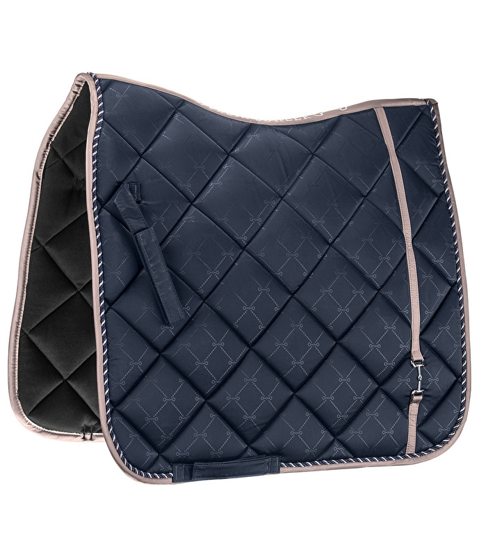 Elegancki czaprak z klasycznym pikowaniem w romby i srebrnym metalowym wędzidłem jako atrakcją. Obrzeże z jasnego kontrastowego materiału i wytłoczony wzór na całej powierzchni nadają czaprakowi wyjątkowy wygląd. Pętle siodłowe i popręgowe z KV. Dół wykonany z pochłaniającej wilgoć i oddychającej tkaniny Air Mesh.