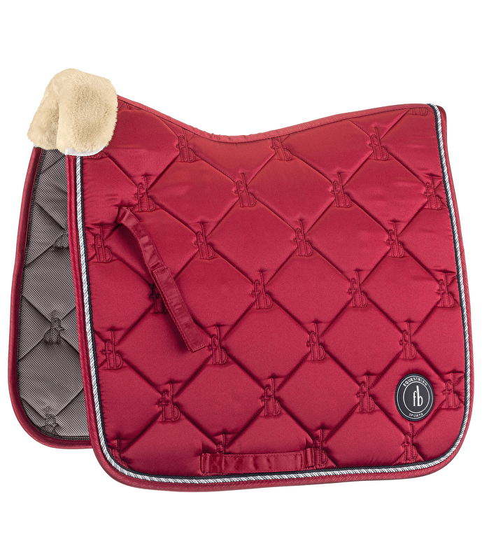 Piękny czaprak marki Felix Buhler model Equestrin Sport. Posiada pikowanie i przeszycia z literami fb świadczącymi o nazwie firmy. Logo okrągłe po obu stronach czapraka. Z przodu naszyte futerko. Lamówka ozdobna w formie dwukolorowego, połyskującego sznurka.