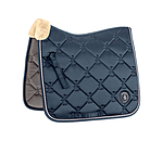Piękny czaprak marki Felix Buhler model Equestrin Sport. Posiada pikowanie i przeszycia z literami fb świadczącymi o nazwie firmy. Logo okrągłe po obu stronach czapraka. Z przodu naszyte futerko. Lamówka ozdobna w formie dwukolorowego, połyskującego sznurka.