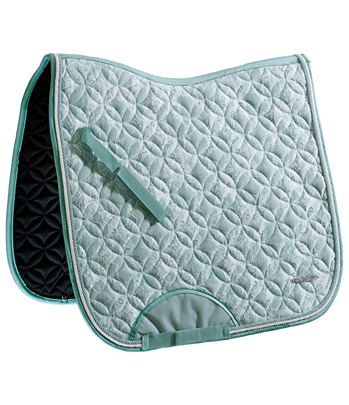 Misternie wykonany czaprak z jedwabistej połyskującej tkaniny z niezwykłym pikowaniem oraz filigranową i dopasowaną kolorystycznie koronką. Dodatkowe szczegóły, takie jak podwójny, błyszczący sznurek ozdobny i logo Felixa Bühlera w kolorze różowego złota dla koloru BE, srebrnego dla GC, DF i NU oraz złotego dla S. Z KV na siodełku i szlufkach podszytych ochroną przed przetarciem. Spód wykonany z pochłaniającej wilgoć siateczki powietrznej. 100% poliestru. P: długość pleców 56 cm, głębokość 47 cm