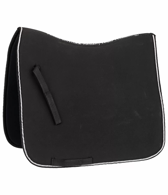 Innowacyjny czaprak wykonany z pianki z pamięcią kształtu, który ustępuje pod naciskiem, a następnie powraca do pozycji wyjściowej, zapewniając w ten sposób optymalny rozkład nacisku. Oprawa w subtelne, brokatowe paski w kolorze srebrnym oraz haft wzdłuż tylnej linii. Pętle na siodło i popręg z KV. Spód odprowadzający pot. 100% poliestru.