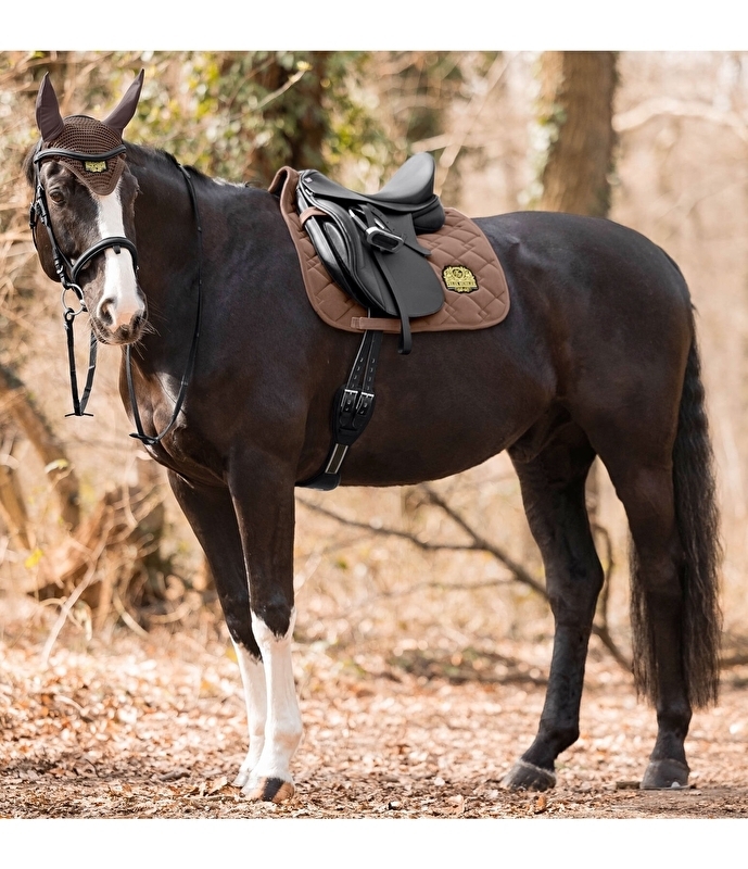 Szykowny, wyjątkowo wygodny czaprak o aksamitnym wyglądzie z pikowaniem w kształcie rombu. Elegancki, złoty haft z logo sprawia, że wygląda wyjątkowo elegancko. Pętle siodła i popręgu z KV. Spód wykonany z pochłaniającej wilgoć i oddychającej tkaniny z przewiewnej siateczki. 100% poliestru.