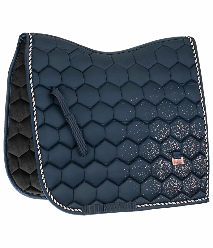 Piękny czaprak z metalowymi płytkami i wytłoczonym logo, otoczony nadrukowanymi, wielokolorowymi drobinkami brokatu i trójkolorowym, błyszczącym ozdobnym sznurkiem. Tabliczka do grawerowania i nadruk w kolorze złota. Szlufki na siodełko i pasek z praktycznym KV. Spód wykonany z oddychającej i pochłaniającej wilgoć siateczki powietrznej. 100% poliestru.