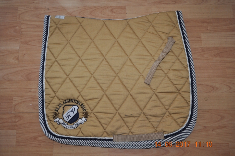 Posiadam na sprzedaż używany, w bardzo dobrym stanie, czaprak beżowy firmy HV Polo w rozmiarze cob/full. Profil ujeżdżeniowy, czaprak obszyty lamówką w biało-niebieskie, skośne pasy, zdobiony sznureczkami w kolorze białym i granatowym. Logo z dwóch stron w dolnym rogu. Ślady użytkowania jak na zdjęciach.