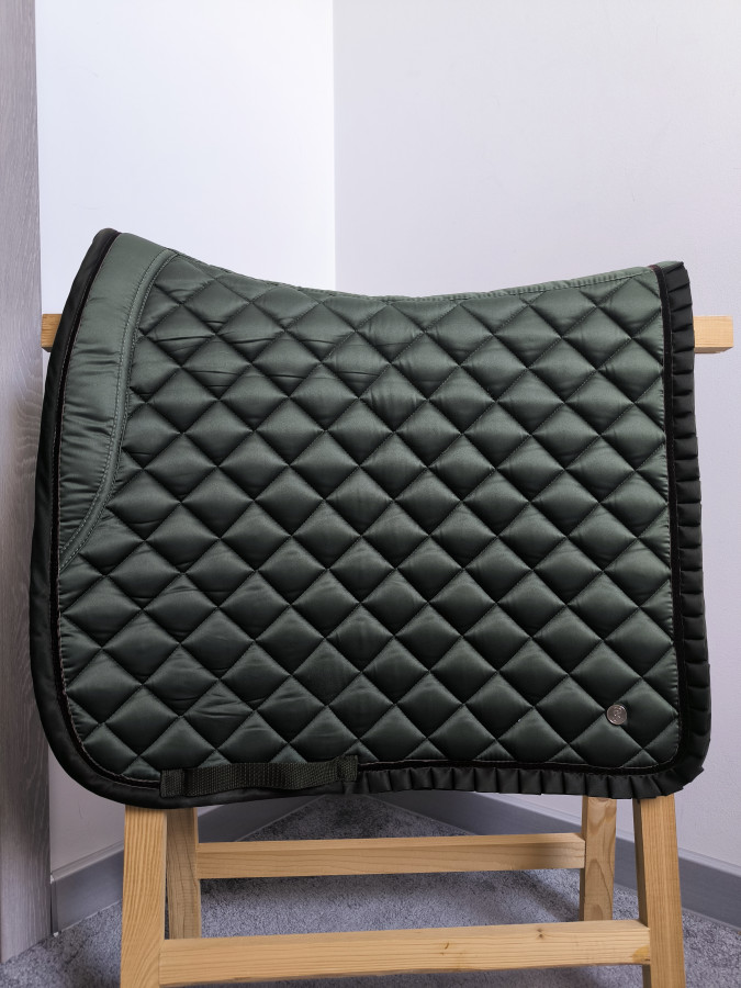 Czaprak ps of sweden. Przepiękny model charakteryzuję się ciekawa lamowka w falbankę z aksamitna tasiemka co dodaje mu uroku i slodkosci. Do tego ten elegancki kolor ciemniejszy zielony w połączeniu z brązowymi elementami tworzą elegancka całość .. poprostu czaprak idealny! Poduszka z przodu zapobiega przesuwaniu się czapraka. Ładnie anatomicznie profilowany. Zdecydowanie warty polecenia. Wybór wielu osób. Od spodu oddychająca siateczka. stan bardzo dobry lekkie ślady użytkowania..Od spodu trochę włosa ale nic poza tym. Rozmiar Full ujezdzeniowy profil