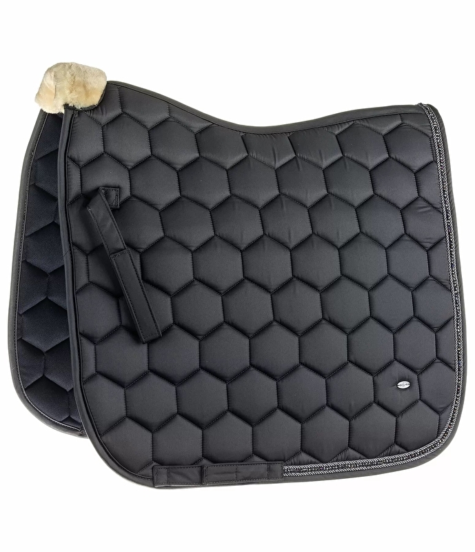 Błyszczący czaprak z dużym, sześciokątnym pikowaniem i miękką wyściółką z pluszowego polaru dla optymalnego komfortu. Obrzeże z małymi, błyszczącymi cyrkoniami, które otoczone są dwoma ozdobnymi sznurkami. Dyskretnie grawerowana tabliczka z logo. Pętle na siodełko i popręg z praktycznymi KV. Spód wykonany z pochłaniającego wilgoć i oddychającego materiału siateczkowego. 100% poliestru.