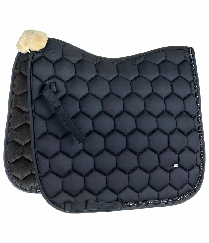 Błyszczący czaprak z dużym, sześciokątnym pikowaniem i miękką wyściółką z pluszowego polaru dla optymalnego komfortu. Obrzeże z małymi, błyszczącymi cyrkoniami, które otoczone są dwoma ozdobnymi sznurkami. Dyskretnie grawerowana tabliczka z logo. Pętle na siodełko i popręg z praktycznymi KV. Spód wykonany z pochłaniającego wilgoć i oddychającego materiału siateczkowego. 100% poliestru.
