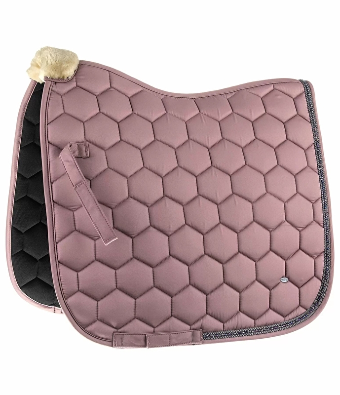 Błyszczący czaprak z dużym, sześciokątnym pikowaniem i miękką wyściółką z pluszowego polaru dla optymalnego komfortu. Obrzeże z małymi, błyszczącymi cyrkoniami, które otoczone są dwoma ozdobnymi sznurkami. Dyskretnie grawerowana tabliczka z logo. Pętle na siodełko i popręg z praktycznymi KV. Spód wykonany z pochłaniającego wilgoć i oddychającego materiału siateczkowego. 100% poliestru.