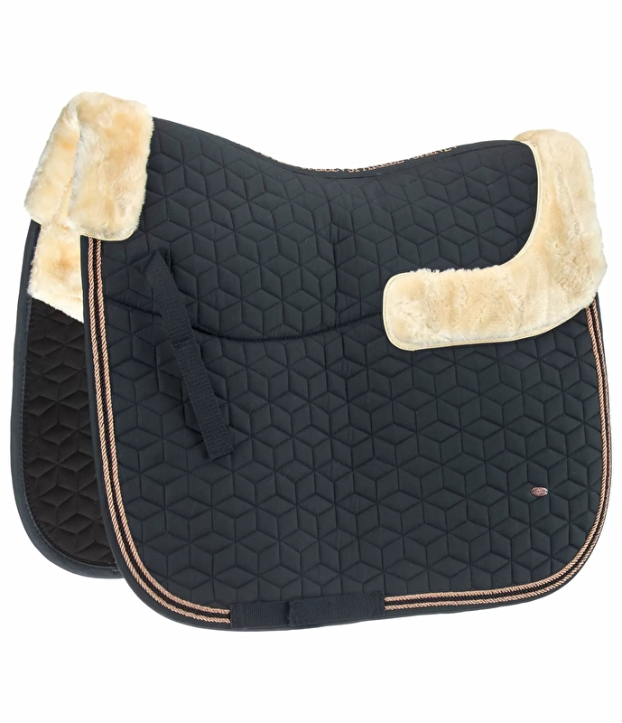 Piękny czaprak z wyszukanym pikowaniem i pluszową wyściółką z z futra w obszarze całej powierzchni siodła, na kłębie i na krawędzi siodła. Obszyty trzema dopasowanymi kolorystycznie, błyszczącymi sznurkami ozdobnymi. Z subtelną metalową blaszką z logo i haftem z brokatową nicią wzdłuż tylnej linii. Wyposażony w szlufki na siodło i popręg z praktycznymi KV.