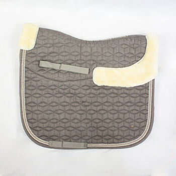 Piękny czaprak z wyszukanym pikowaniem i pluszową wyściółką z z futra w obszarze całej powierzchni siodła, na kłębie i na krawędzi siodła. Obszyty trzema dopasowanymi kolorystycznie, błyszczącymi sznurkami ozdobnymi. Z subtelną metalową blaszką z logo i haftem z brokatową nicią wzdłuż tylnej linii. Wyposażony w szlufki na siodło i popręg z praktycznymi KV.