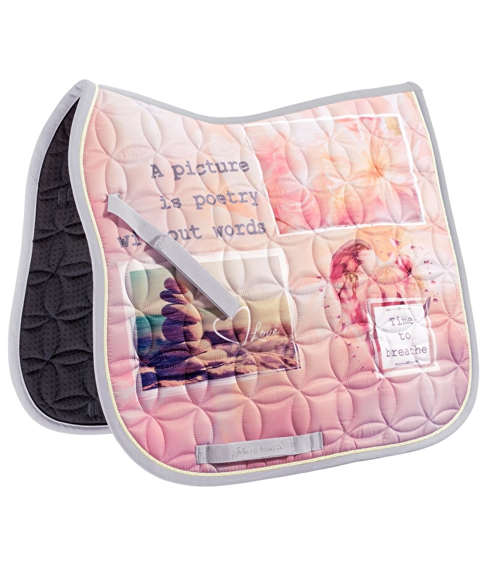 Uroczy czaprak wykonany z nadrukiem kolażu zdjęć. Ozdobny sznurek i lamówka w kontrastowych kolorach. Paski do siodła i do popręgu zapinane na rzep. Spód wykonany z oddychającej i pochłaniającej wilgoć tkaniny. Materiał wierzchni i podszewka 100% poliester, materiał dolny 100% bawełna. Długość pleców 51 cm, głębokość 47 cm
