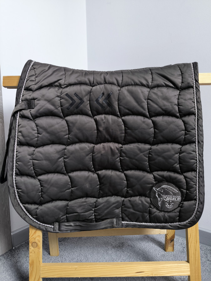 Czaprak ujezdzeniowy DL eskadron. Kolekcja Platinum. Kolor ciemny brąz ciężko mi go uchwycić na zdjęciu. Posiada paski do przystuł, siliknowe wstawki które zapobiegają przemieszczaniu siodła. Sam materiał grubszy sliski który nie łapie brudu. Stan dobry. Małe przetarcie przy popregu i na silikonie nie widoczne pod siodłem. Raczej starsza kolekcja.