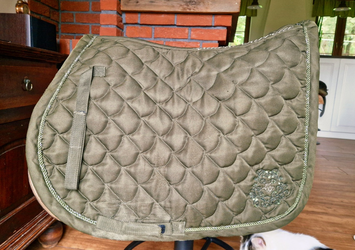 Sprzedam czaprak wszechstronny, rozmiar full. W kolorze ciepłej, ciemnej zieleni. Wykończony piękną, haftowaną aplikacją z cekinami. Czaprak firmy Lauria Garrelli, model Paris. Zdjęcia niestety zupełnie nie oddają koloru. Nie jest sprany, nie jest to khaki, to ciepła "pełna" zieleń. Czaprak nosi ślady użytkowania widoczne na zdjęciach, lekkie przetarcia i zmechacenia przy popręgu, oraz jeden puszczony szew pikowania (od dawna tak jest i nie idzie to dalej).