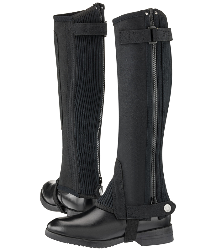 Przetestowane czapsy STEEDS Ecolette są wykonane z wytrzymałej skóry syntetycznej Amara i zachwycają swoim dopasowanym, anatomicznym kształtem. Ciągły zamek błyskawiczny umożliwia szybkie zakładanie i zdejmowanie. Rozciągnięcie prążkowanych, elastycznych części bocznych zapewnia trwałe dopasowanie. Elastyczny mostek pewnie trzyma czapsy na kostce, a dodatkowo uzupełnia go guzik nad zamkiem. Czapsy można indywidualnie mocować za pomocą pasków na rzep. Materiał zapewnia optymalną przyczepność do siodła i nie staje się śliski, nawet gdy jest mokry. Dzięki nieskomplikowanym i łatwym w utrzymaniu właściwościom materiału, można je bardzo łatwo wyczyścić - kurz i wysuszony brud nie stanowią już problemu. Można prać w pralce w 30 ° C.