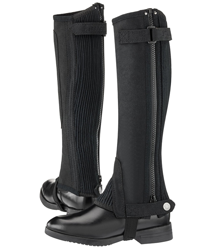 Przetestowane czapsy STEEDS Ecolette są wykonane z wytrzymałej skóry syntetycznej Amara i zachwycają swoim dopasowanym, anatomicznym kształtem. Ciągły zamek błyskawiczny umożliwia szybkie zakładanie i zdejmowanie. Rozciągnięcie prążkowanych, elastycznych części bocznych zapewnia trwałe dopasowanie. Elastyczny mostek pewnie trzyma czapsy na kostce, a dodatkowo uzupełnia go guzik nad zamkiem. Czapsy można indywidualnie mocować za pomocą pasków na rzep. Materiał zapewnia optymalną przyczepność do siodła i nie staje się śliski, nawet gdy jest mokry. Dzięki nieskomplikowanym i łatwym w utrzymaniu właściwościom materiału, można je bardzo łatwo wyczyścić - kurz i wysuszony brud nie stanowią już problemu. Można prać w pralce w 30 ° C. Ocieplane od wewnątrz polarem.