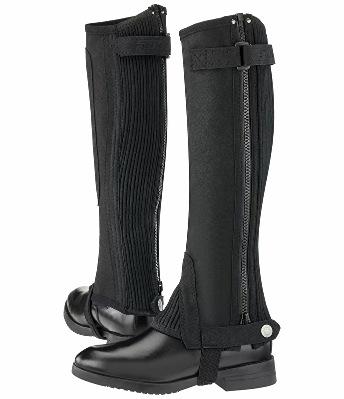 Przetestowane czapsy STEEDS Ecolette są wykonane z wytrzymałej skóry syntetycznej Amara i zachwycają swoim dopasowanym, anatomicznym kształtem. Ciągły zamek błyskawiczny umożliwia szybkie zakładanie i zdejmowanie. Rozciągnięcie prążkowanych, elastycznych części bocznych zapewnia trwałe dopasowanie. Elastyczny mostek pewnie trzyma czapsy na kostce, a dodatkowo uzupełnia go guzik nad zamkiem. Czapsy można indywidualnie mocować za pomocą pasków na rzep. Materiał zapewnia optymalną przyczepność do siodła i nie staje się śliski, nawet gdy jest mokry. Dzięki nieskomplikowanym i łatwym w utrzymaniu właściwościom materiału, można je bardzo łatwo wyczyścić - kurz i wysuszony brud nie stanowią już problemu. Można prać w pralce w 30 ° C