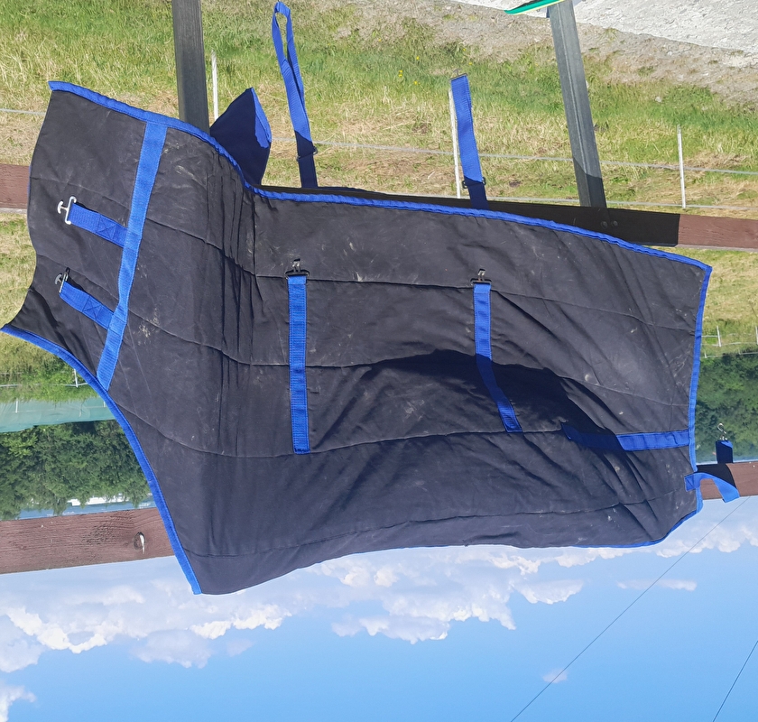 Sprzedam derkę 140cm ocieplaną stajenną zimową. Określam ją jako średnio grubą. Derka z zewnątrz jest obszyta czarną, grubą bawełną, wypełnienie z watoliny i od środka niebieski polar. Posiada dwie klamry na piersiach, dwa zapięcia pod brzuchem i zapięcie na karabinek pod ogon.