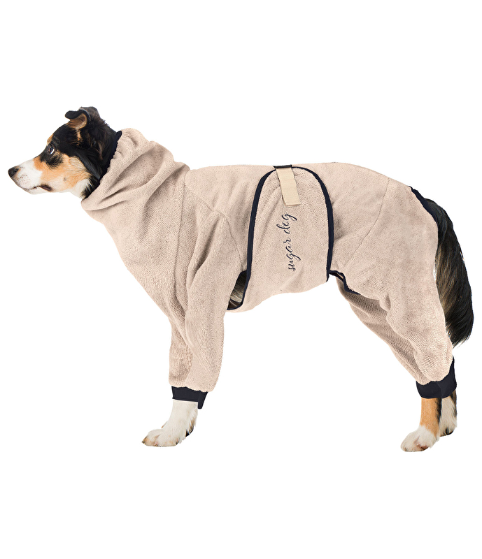 Idealny dla miłośników wody lub deszczowych dni: Derka dla psa wykonana z miękkiego, szybkoschnącego i pochłaniającego wilgoć ręcznika frotte z klapą na brzuchu, wysokimi osłonami na szyję i nogi dla doskonałej wszechstronnej ochrony. Chroni samochód i dom przed wilgocią i brudem. Klapa na brzuchu z prostym zapięciem na klips z regulacją długości. Zamek błyskawiczny biegnący z tyłu do nasady szyi ułatwia zakładanie i zdejmowanie: Najpierw całkowicie rozepnij zapięcie zatrzaskowe i zamek błyskawiczny z tyłu, a następnie pozwól psu wsunąć głowę przez część szyjną i ostrożnie poprowadź nogi przez przewidziane otwory. Następnie najpierw zamknij zamek błyskawiczny, a następnie zapięcie zatrzaskowe. W razie potrzeby zmień obwód klapy na brzuchu, aby zapewnić bezpieczne dopasowanie. 80% poliester, 20% nylon.