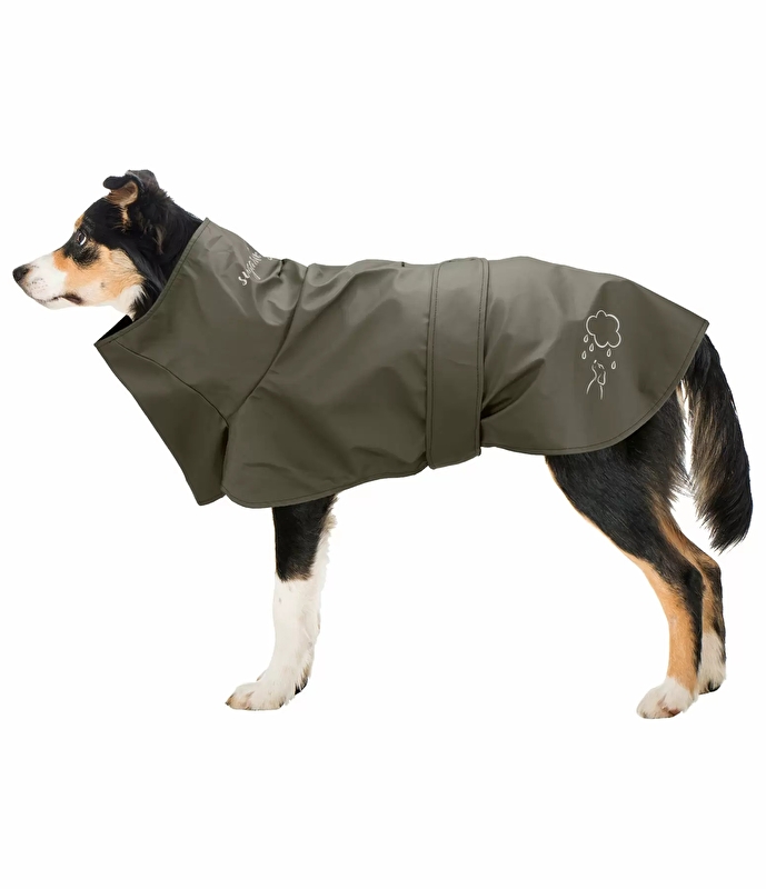 płaszcz przeciwdeszczowy wykonany z wodoodpornego i wiatroszczelnego materiału PVC z gładką, przyjazną dla futra dżersejową podszewką, która nie elektryzuje się. Inspirowany parasolem, rozszerzany krój z przodu zapewnia optymalną ochronę przednich nóg przed deszczem, jednocześnie zapewniając maksymalną swobodę ruchów dzięki marszczeniu w okolicy ramion. Z wysokim dekoltem i regulowanym zapięciem na zatrzask. Wystarczy założyć go na głowę psa i zapiąć pasek wokół tułowia. Odblaskowe nadruki zwiększające bezpieczeństwo w ruchu drogowym. Materiał zewnętrzny 100% poliuretan, podszewka 100% poliester.