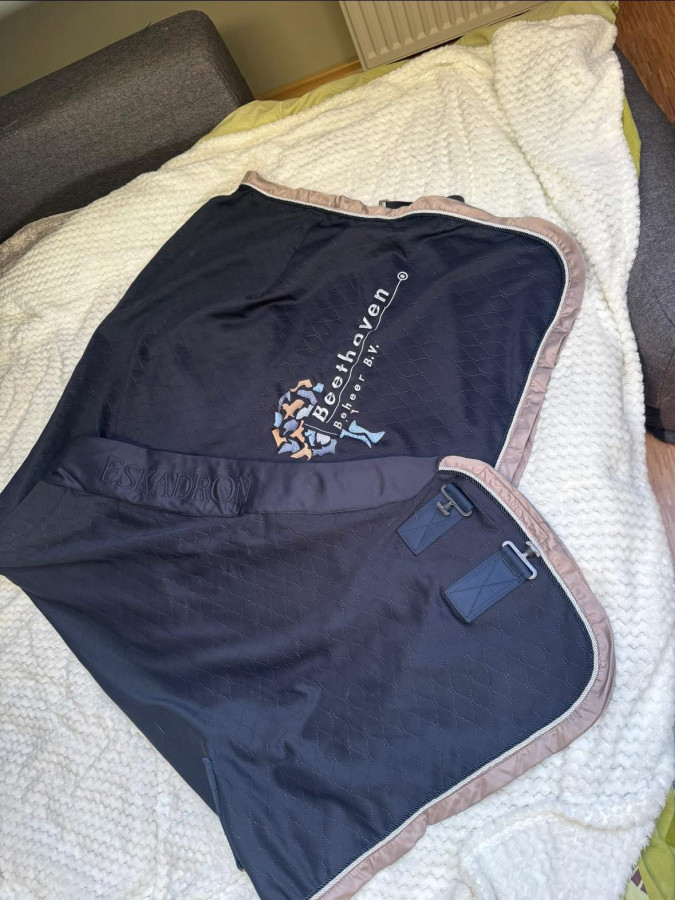 Derka Eskadron osuszająca z materiału technicznego, rozmiar S - 125cm, granatowa. Na kłębie podszyta futerkiem, na szyi wytłoczony napis ESKADRON.