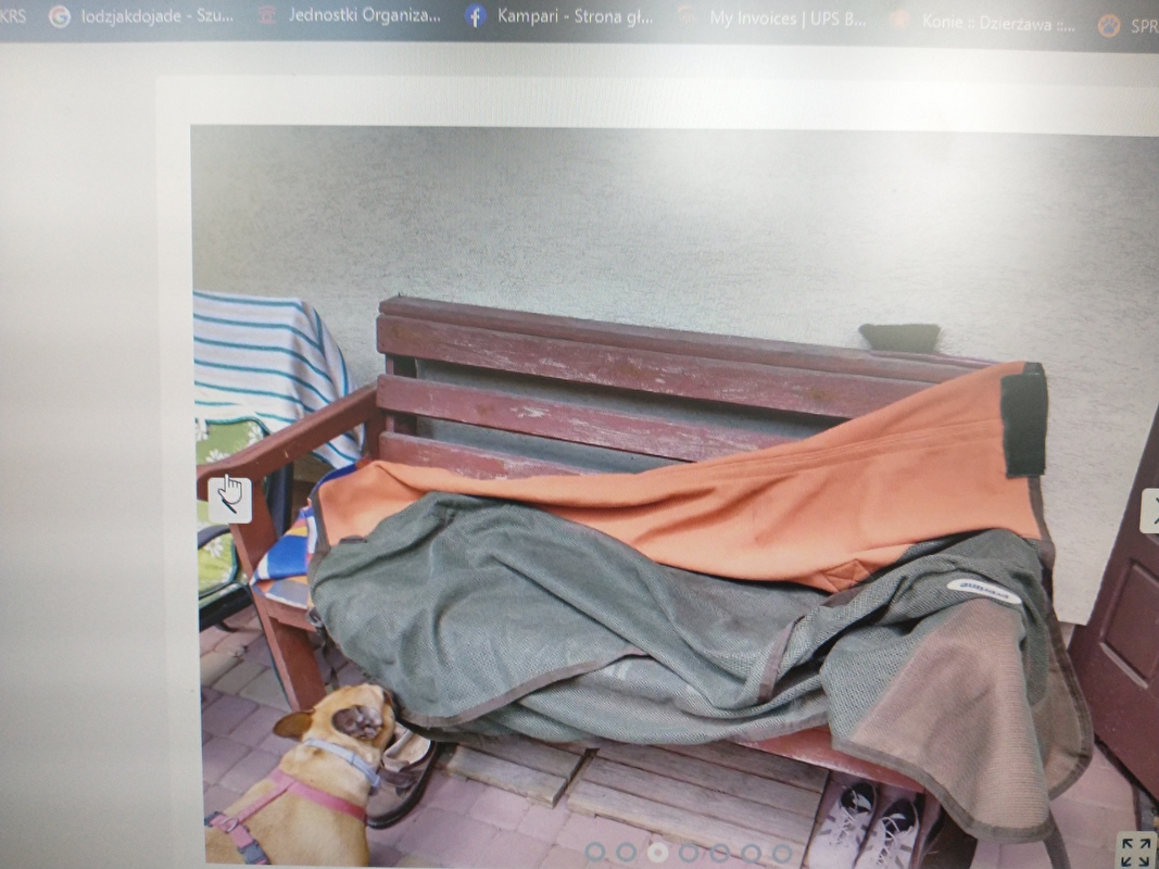 Sprzedam siatkową derkę, kilka razy używaną, miękka część pomarańczowa polarowa wzdłuż końskiego grzbietu od spodu i część siatkowa ciemna zieleń, z zielonym aksamitnym kołnierzem.