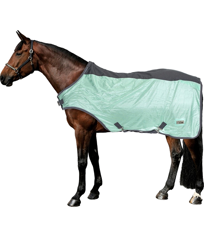 Świetne połączenie kolorów i materiałów. Linia pleców jest wykonana z eleganckiego, wodoodpornego poliestru Oxford (600 denierów). Boki wykonane z lekkiej, przepuszczającej powietrze siatki, która zapewnia dobrą cyrkulację powietrza i chroni przed irytującymi muchami. Linia tylna ma gładką nylonową podszewkę od wewnątrz, aby uniknąć otarć. PAsy krzyżowe, zabezpieczenie polarowe przy kłębie i proste zamknięcie klatki piersiowej (hak w kształcie litery T). Wysoki krój na ramionach zapewnia maksymalną swobodę ruchów. Odblaskowe lamówki dla dodatkowego bezpieczeństwa. 100% poliestru.