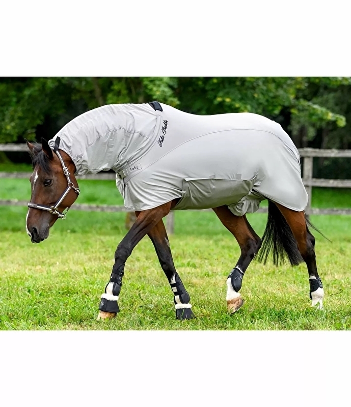 Szczególnie wszechstronna derka na egzemę z kombinacją ciasno tkanego i rozciągliwego materiału funkcjonalnego chroniącego przed owadami oraz materiału siateczkowego. Kaptur jest połączony z derką za pomocą dwóch solidnych zamków błyskawicznych. Zapięcie na piersi w kształcie litery T z regulacją rozmiaru, obszerna klapa pod brzuch zapinana na rzepy, miękka wyściółka z polaru na kłębie i klatce piersiowej, podwójna klapa na ogon. 100% poliestru.