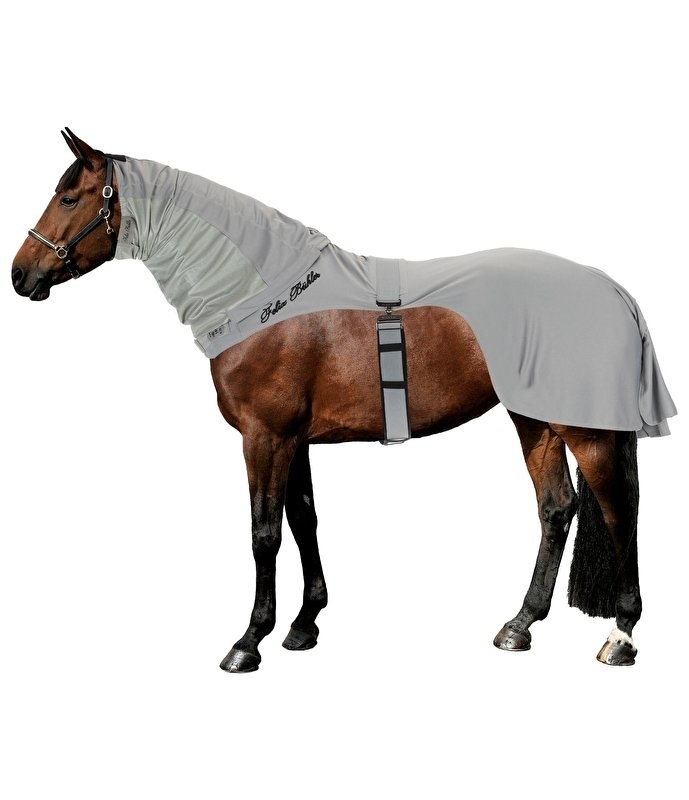 Derka przeciw muchom wykonana z ciasno tkanego, oddychającego i rozciągliwego funkcjonalnego materiału chroniącego przed owadami w nowoczesnym, pełniejszym kroju. Derka przykrywa i chroni typowe obszary chorobowe, ale pozostawia wszystkie inne części ciała wolne, co oznacza, że derka może być noszona przez konia nawet w szczególnie upalne dni, a ciepło ciała może z łatwością uciec. Odpinana część szyjna z jest połączona z derką za pomocą dwóch solidnych zamków błyskawicznych. Zapięcie na piersi z haczykiem w kształcie litery T z regulacją rozmiaru, które jest również obficie wyłożone miękką gumą chloroprenową, dzięki czemu zapobiega uciskom i otarciom. Miękka wyściółka z polaru na kłębie i klatce piersiowej. Elastyczny pas biodrowy z miękkim wypełnieniem z kauczuku chloroprenowego. Szeroka, podwójna klapa ogonowa z KV niezawodnie zapobiega przedostawaniu się owadów. W zestawie elastyczny pasek na ogon. 100% poliestru.