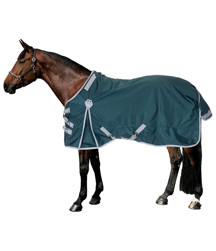 Funkcjonalna i wyjątkowo odporna na rozdarcia derka padokowa, klasyczny dekolt (regularny dekolt) wykonana z materiału 1680 denierów o bardzo wysokiej wodoodporności (słup wody 5000 mm), innowacyjna powłoka teflonowa i bardzo dobra oddychalność, która niezawodnie chroni konia od złej pogody. Odciążające, rozciągliwe wstawki w okolicy ramion/szyi wykonane z elastycznego, wysoce wodoodpornego materiału softshell oraz duże kliny zapewniają zupełnie nową swobodę ruchów i zapobiegają klasycznym, niepożądanym punktom ucisku. Wewnętrzna, obszerna wyściółka dla dodatkowej minimalizacji nacisku w okolicy kłębu. Oryginalny materiał ochronny DuPont TEFLON Fabric Protector zapewnia optymalny efekt kropelkowania wody, najlepszą odporność na zabrudzenia i długotrwałą ochronę włókien materiału zewnętrznego. Zapięcie przednie z potrójnym balansem i możliwością regulacji szerokości, z 2 karabińczykami i 2 pierścieniami oraz dodatkowym KV. Gładka, przyjazna dla futra podszewka. Regulowane pasy krzyżowe i urządzenie do opcjonalnego mocowania pasów udowych. Pasek na ogon z regulacją długości i klapa na ogon z odblaskowymi paskami i odblaskową lamówką dookoła.