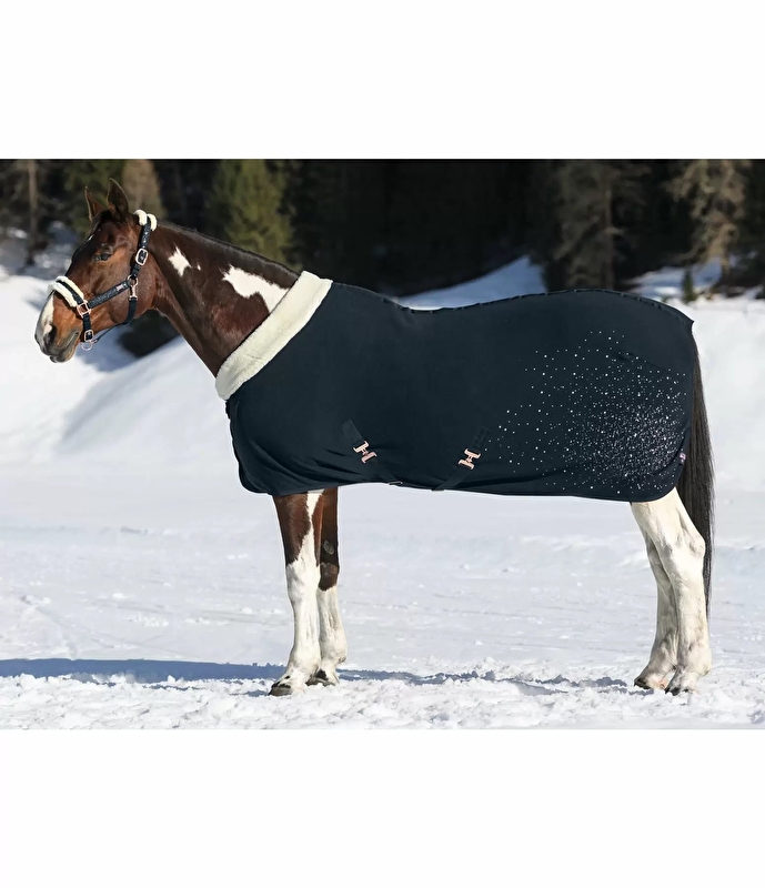 Przyjemnie ocieplająca derka z polaru z miękkim, grubo wyściełanym kołnierzem z pluszowego polaru. Czarujący nadruk z wielobarwnych drobinek brokatu w tylnej części. Gładka, przyjazna dla futra podszewka w klatce piersiowej i ramionach, aby uniknąć otarć. Z odpinanymi pasami krzyżowymi po obu stronach, ukrytym zapięciem w kształcie litery T z przodu i regulowanym paskiem na ogon. Okucia w kolorze różowego złota. 100% poliestru.