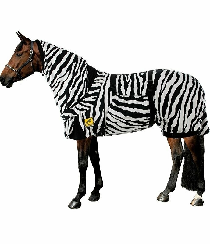 Derka marki Felix Buhler model Zebra. Lekka i miękka. Elastyczna, rewelacyjnie dopasowuje się do budowy anatomicznej konia. Derka służy jako ochrona przeciw owadom, ale także jest derką egzemową. Dobrze leży dzięki zastosowaniu bardzo elastycznego materiału. Przymocowany na stałe kołnierz o regulowanym obwodzie na styku nasady szyi i łopatki. Wykończenie kołnierza przylegające, elastyczne, z możliwością regulacji. Klapa pod brzuchem mocowana optymalnymi, elastycznymi pasami. Elastyczne paski między zadnimi nogami. Bardzo duża klapa na ogon. Wykonana z oddychającej, szybkoschnącej mieszanki poliestrów. Materiał jest odporny na działanie promieni UV.