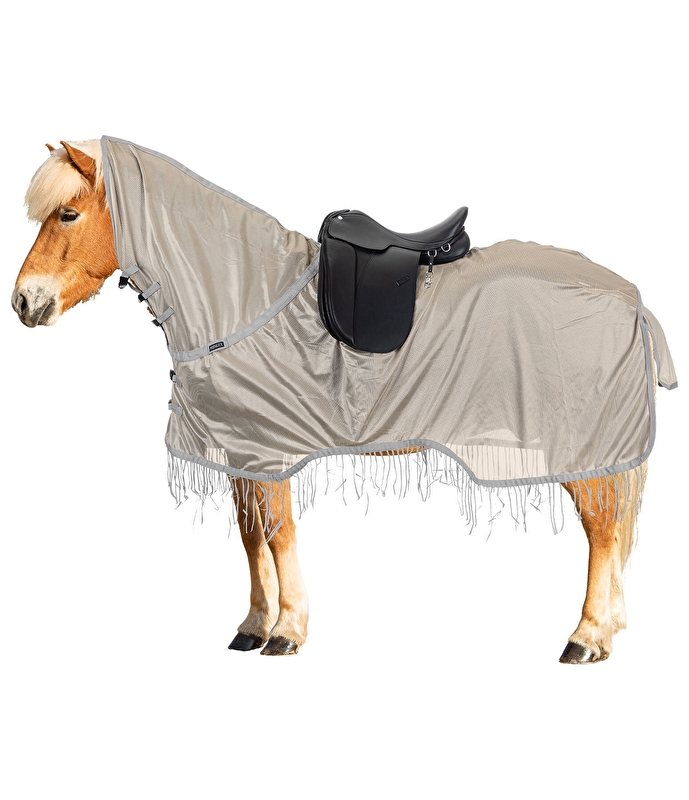 Praktyczna derka jeździecka dla koni wykonana z przewiewnej siateczki chroniącej przed muchami. Z kapturem jako dodatkowym mechanizmem ochronnym. Ze specjalnym wycięciem na siodło , elastycznymi pętlami do przymocowania do nakrycia głowy, zapięciami na klatce piersiowej i szyi oraz klapą na ogon. 100% poliester.
