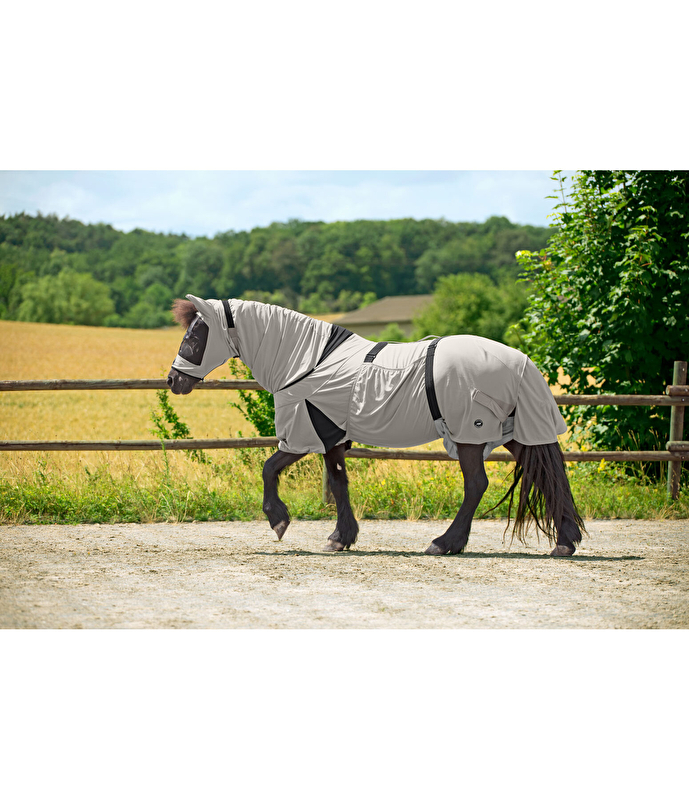 Ta derka jest zbawieniem dla Twojego czworonożnego przyjaciela cierpiącego na egzemę. Składa się z oddychającego, cienkiego funkcjonalnego materiału włóknistego i dlatego ma tę zaletę, że wysycha wyjątkowo szybko. Szyja i ogon są optymalnie zakryte. Istnieje również klapa brzuszna, którą można zdjąć za pomocą klipsów oraz zdejmowana osłona narządów płciowych i wymion wykonana z przepuszczającej powietrze i płyny siateczki chroniącej przed czarnymi muchami. Pomimo wszechstronnej ochrony derka zapewnia optymalną swobodę ruchów na padoku dzięki elastycznemu materiałowi.