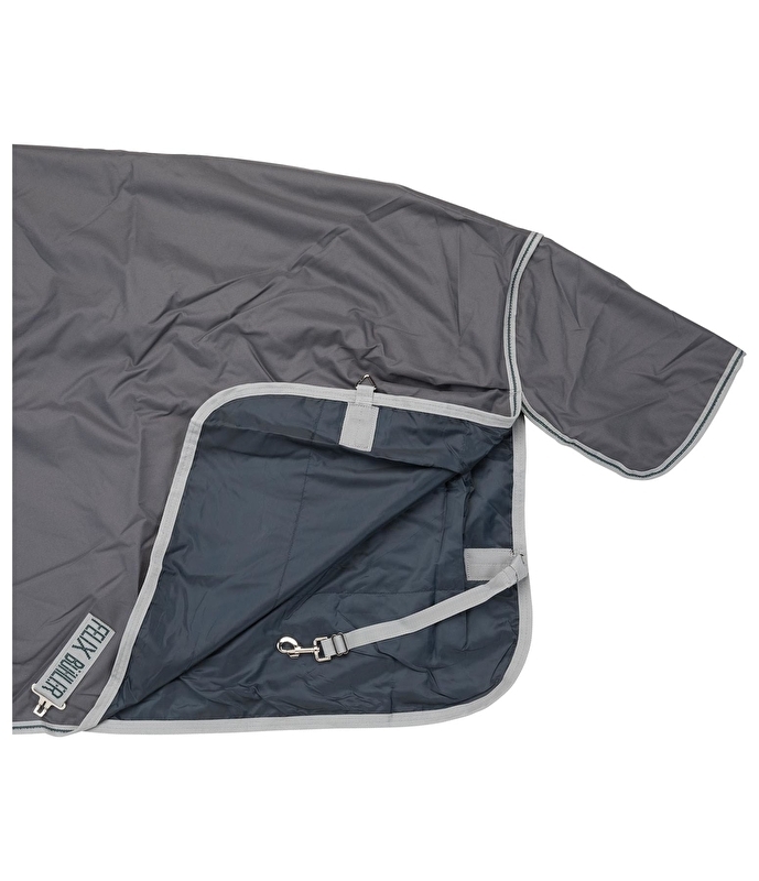 Wodoodporny i oddychający materiał derki z wysokim kołnierzem (600D). Wnętrze derki ma gładką poliestrową podszewkę: zapobiega otarciom i łamaniu się sierści, futro pozostaje gładkie i lśniące. Zamknięcie z przodu w kształcie litery V i specjalne wycięcie na przednią nogę zapewniają optymalną swobodę ruchów i doskonałe dopasowanie. 100% poliestru.
