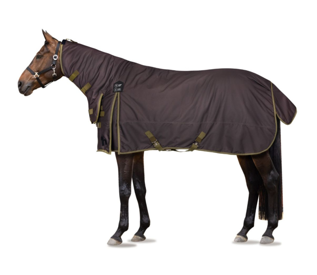 Derka zimowa z pełnym kapturem Horze Avalanche, 350g 1200D, rozmiar: 155, kolor brązowy z zieloną lamówką.