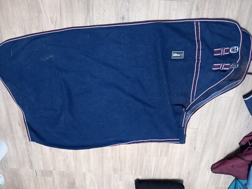 Sprzedam derkę polarową, stan dobry. Była zwężana obustronnie przy szyi, przy zapięciach na klacie posiada niewielkie naderwania materiału. Nie ma pasów pod brzuchem.