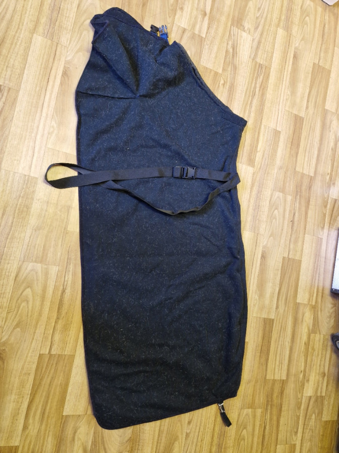 Osuszająca, z dorobionym pasem na sprzączkę. Używana na siwku, więc z widocznymi włoskami. Z zakładkami dla swobodnego ruchu. Wyprana. Dorobiłam do niej kaptur, zakładany na uszy, pod kantar, żeby nie spadał. Wszyte rzepy pozwalają szybko założyć i zdjąć. Idealna na wykąpanego konia, pozwala się osuszyć i nie marznąć na wietrze.